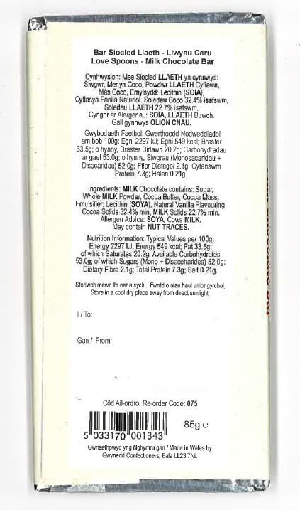 A Luxury Milk chocolate bar, presented in a beautifully illustrated outer sleeve which features a pretty 'Love Spoons'  image.  An ideal present to give your loved one this Dydd Santes Dwynwen.  This item is made in Wales.